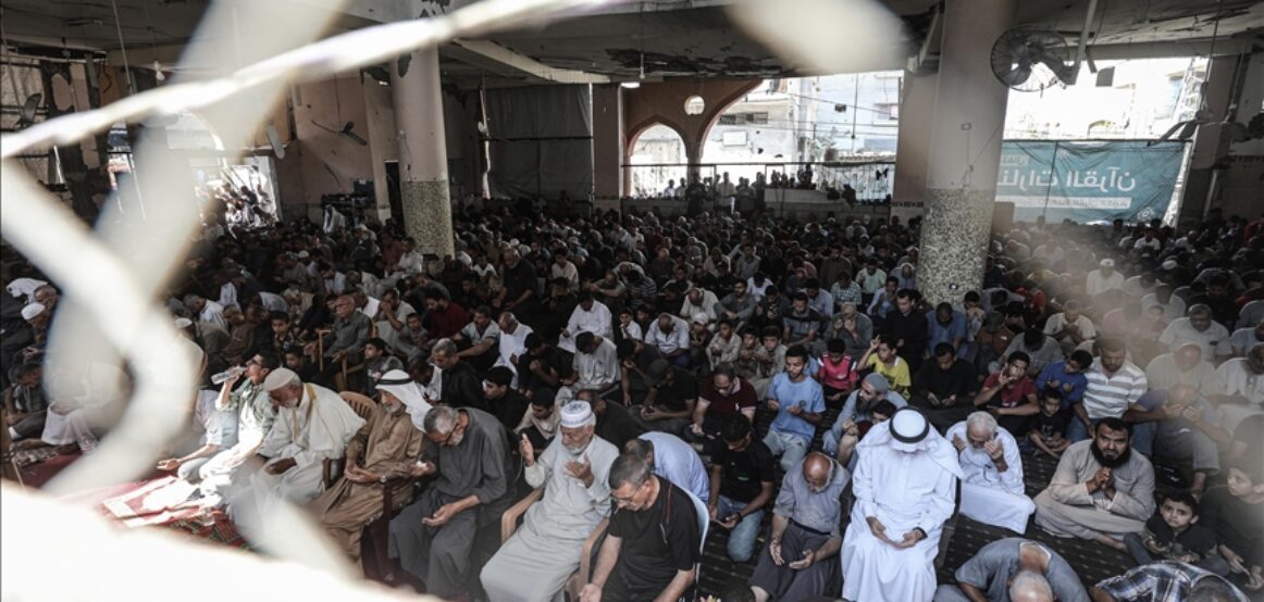 Palestinezët në Khan Younis falën namazin e xhumasë mes rrënojave të xhamisë Al-Albani e cila është thuajse e rrënuar nga bombardimet izraelite, raporton Anadolu.