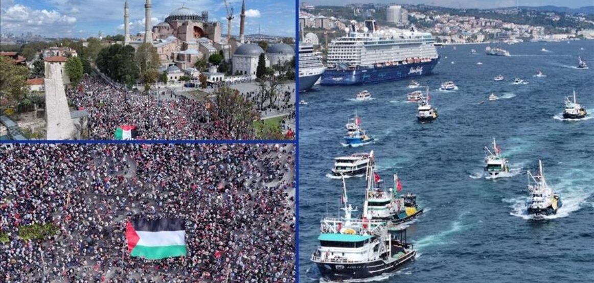 Në disa qytete të Turqisë u zhvilluan të shtunën marshime dhe aktivitete solidariteti në mbështetje të popullit palestinez dhe të flotiljeve që udhëtojnë drejt Gazës të çarë bllokadën izraelite dhe për të dërguar ndihma humanitare, të cilat po sulmohen nga Izraeli, raporton Anadolu.